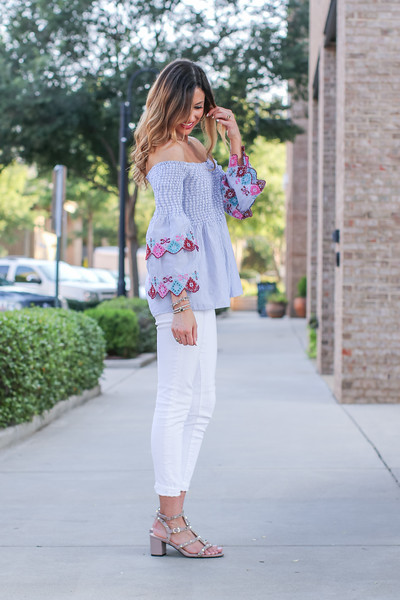 For the days when you want to dress for fall, but it’s still kind of hot out – This off the shoulder gingham top is perfect. The black and white gingham print gives you all the fall feels, while the short off the shoulder sleeves keep you from getting too hot. It’s like an iced pumpkin spice latte (does that even exist? has anyone had one?) Anyways, I paired this top with white jeans and booties for a super...